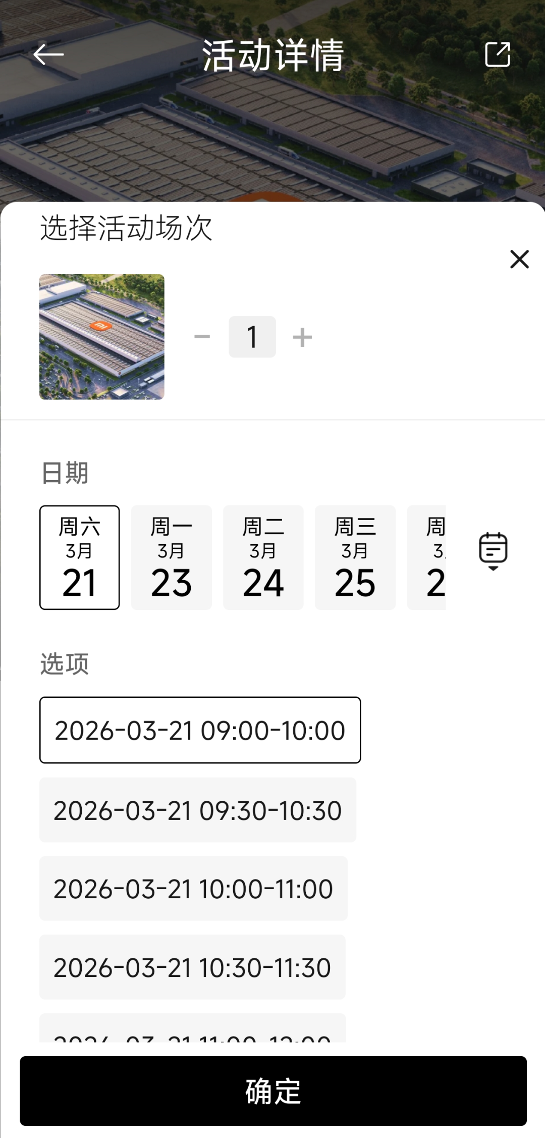 2.点击立即报名,选择活动场次并确认。各时段预订人数上限为4人,仅可在预订时段体验,请提前做好行程安排。小米汽车APP账户积分可抵扣部分费用。