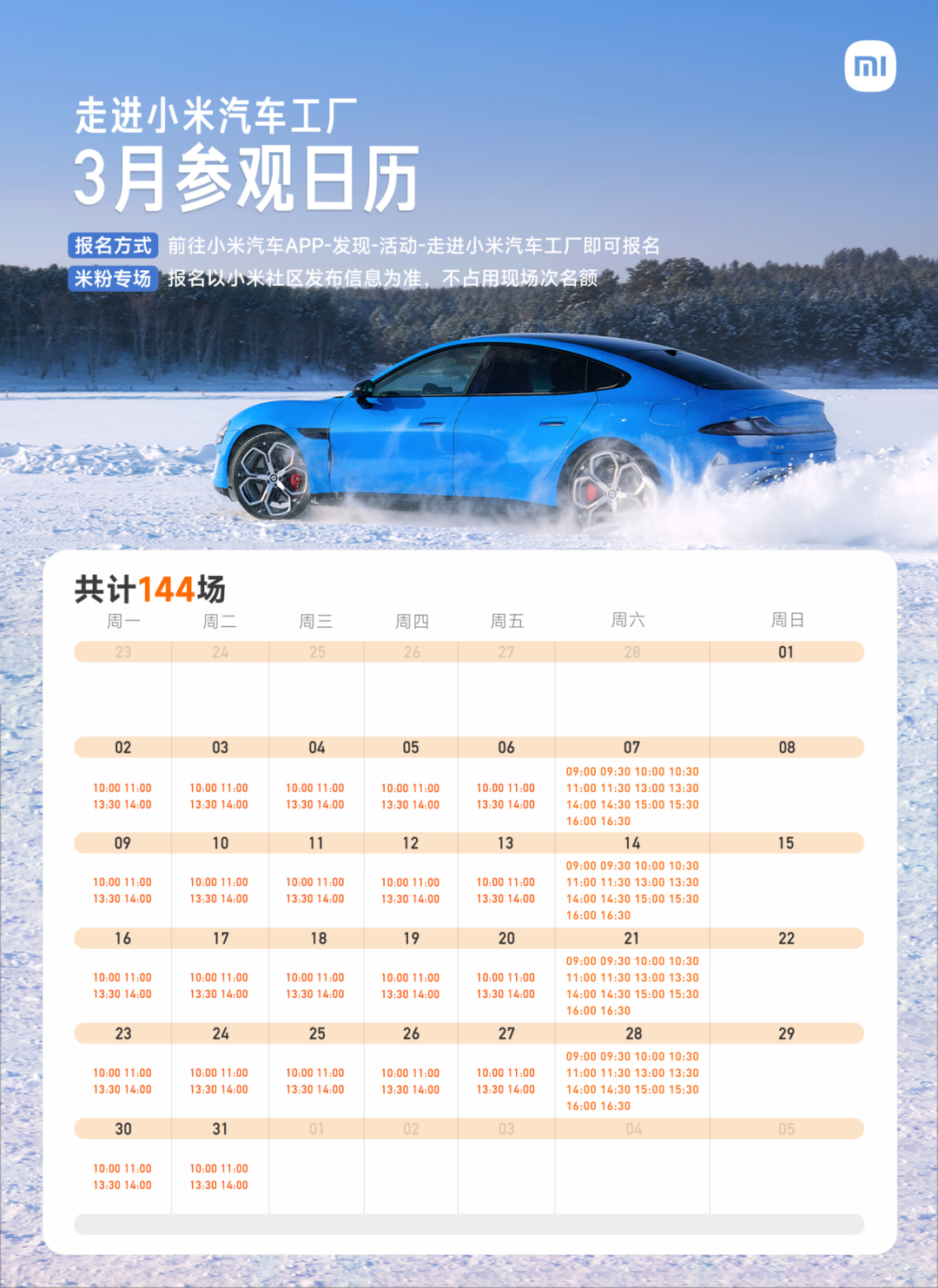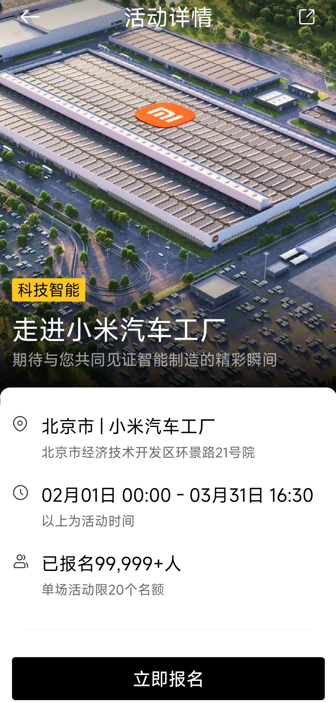 以上参观需通过小米汽车APP另行预约,前往小米汽车APP-发现-活动-走进小米汽车工厂即可报名。