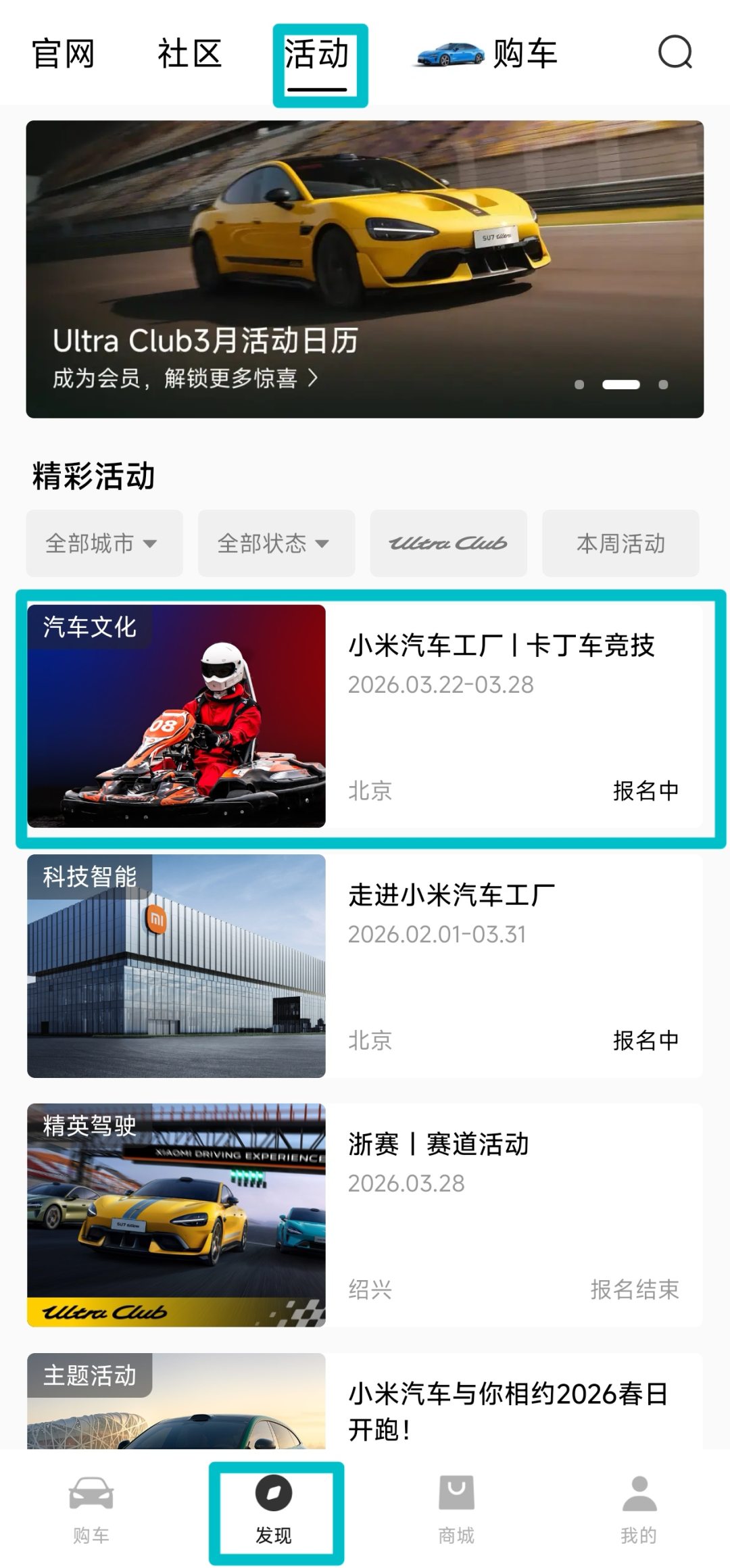 1.前往小米汽车APP-发现-活动-走进小米汽车工厂卡丁车竞技。